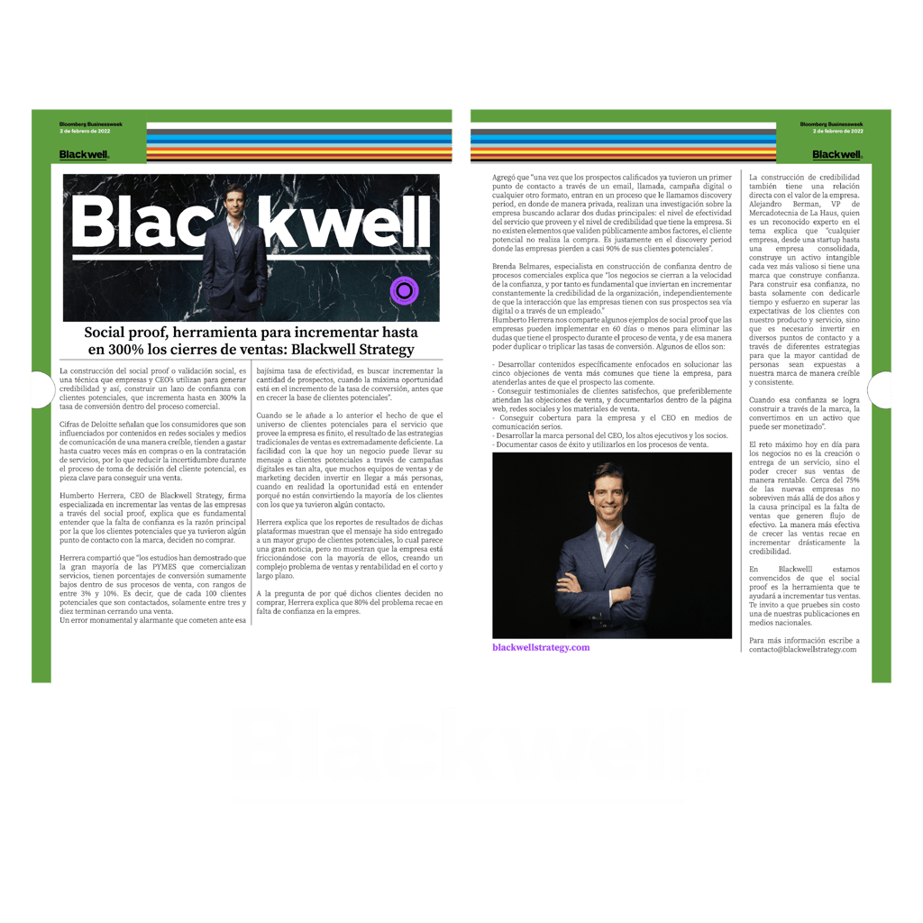Creamos composiciones editoriales que combinan estructura, narrativa y diseño. Destaca el desarrollo de una reseña a doble página para la revista Bloomberg, diseñada para comunicar información con precisión y elegancia visual.